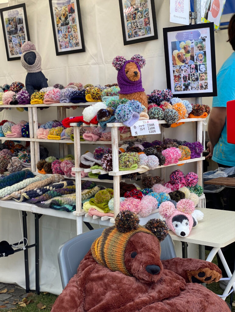 冬には色とりどりのオリジナル手編み商品が並びます。